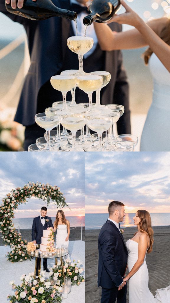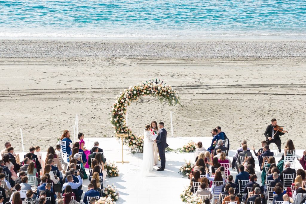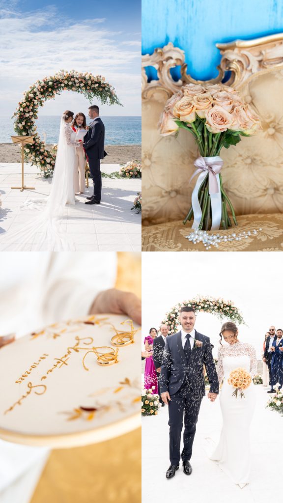 Il grande arco floreale, le sedute bianche per gli ospiti, i sorrisi, le grandi emozioni e lo scambio degli anelli di fronte al mare hanno caratterizzato il momento più importante della giornata: la cerimonia nuziale. Cerimonia che si è svolta direttamente sulla spiaggia e la cui scenografia si è perfettamente integrata con il paesaggio naturale. Il ricevimento nuziale è proseguito in un’atmosfera elegante e luminosa, dove i fiori hanno continuato a essere protagonisti.